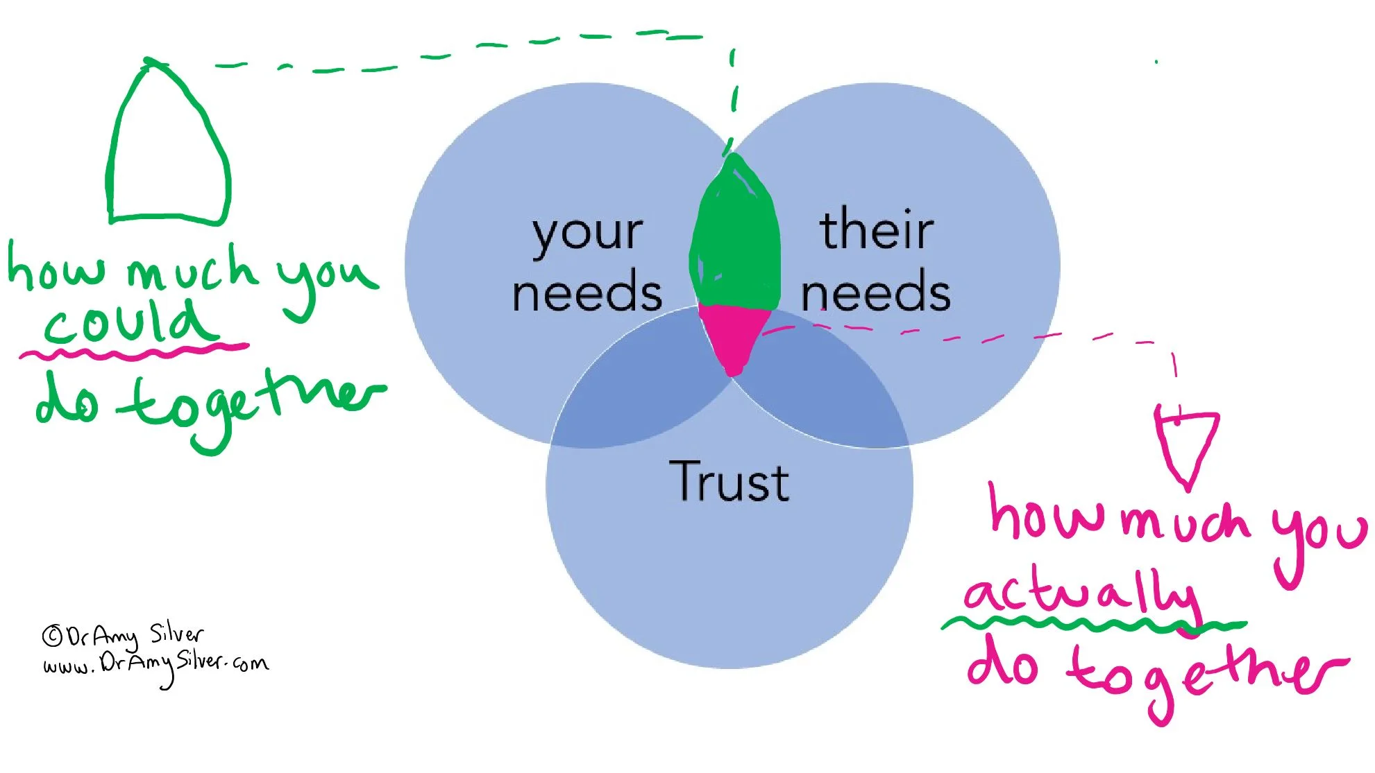 If you want to do more together, focus on trust. The green represents the wasted opportunities where we could be doing more to help each other but we just don't trust each other enough to make it happen. We want more of the lovely pink that shows us how much we actually do together. That pink triangle will increase as that trust bubble moves up. So, perhaps worth a quick thought: